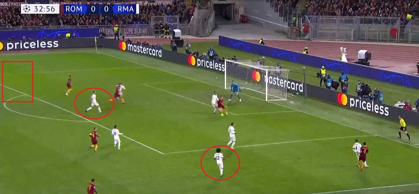 Самый опасный момент, который создала Рома (момент с привозом Карвахаля опустим, там римляне ничего не сделали для создания голевого момента) пришел именно через фланг Марсело. Давайте рассмотрим этот момент поподробнее.