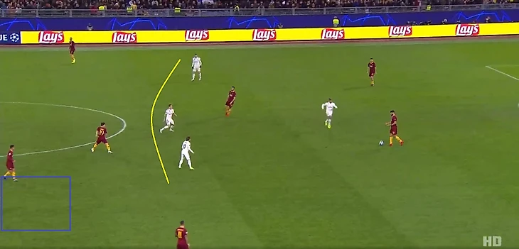 Это была самая масштабная атака Ромы за весь матч. Она произошла сразу после углового, именно поэтому в штрафной Мадрида было так много римлян.