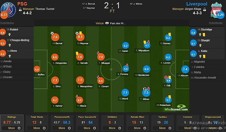 Керер справа и Бернат слева должны были пристально следить за Манэ и Салахом соответственно. Они сделали это безупречно. У "Ливерпуля" не было ни-че-го! От слова совсем. А Бернат отыграл один из лучших матчей в карьере. Как и Керер справа. Тухель просто наглухо закрыл Клоппу фланги. А под конец матча, когда нужно было не терять концентрацию, и освежиться, Тухель выпускает налево Чупо-Мотинга, которого, честно говоря не понятно за какие заслуги пригласили в "ПСЖ", и направо Алвеса. И фланги "Ливерпуля" продолжают биться лбом об бетонную стену.