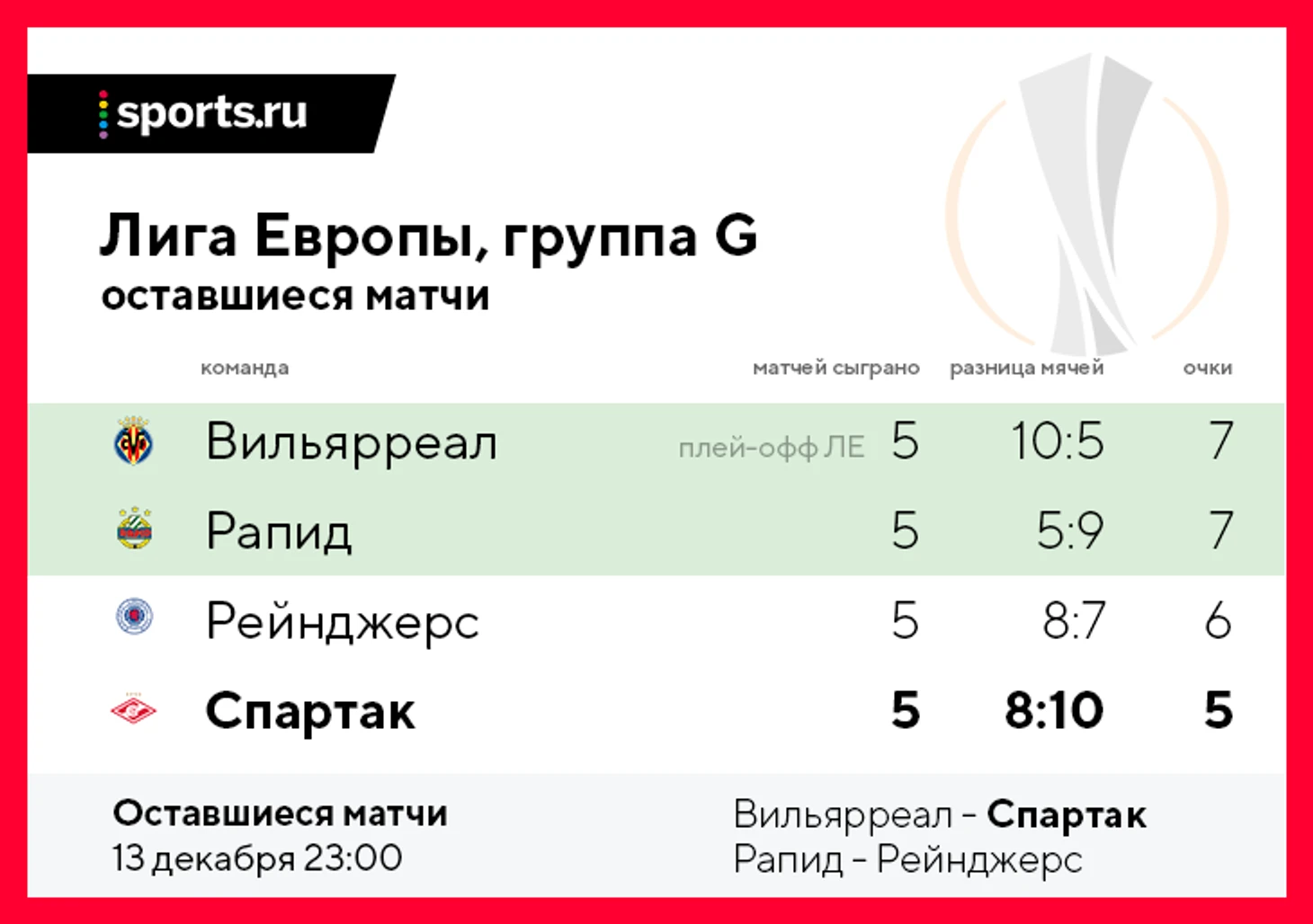 В последнем туре «Спартак» – хозяин собственной судьбы: победа в Испании отправит команду Кононова в плей-офф – независимо от исхода параллельной встречи. Но москвичи точно не займут первое место в группе: в случае равенства очков с «Рапидом» (по 8) австрийцы окажутся выше за счет личных встреч.