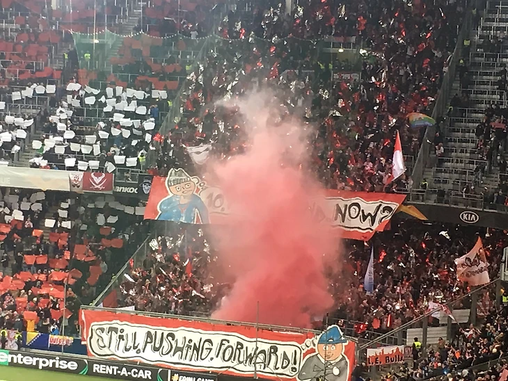 Если предыдущая встреча проходила при пустом «Велодроме», то в этот раз команда, принимающая гостей, не осталась без поддержки: истосковавшиеся по еврокубкам болельщики «Айнтрахта» подготовили очередной огненный перфоманс.
