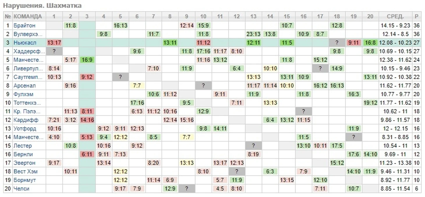 Ещё один лидер хит-парада фолов. Четвёртый результат в лиге по нарушениям показывает "Ньюкасл". Дома, правда, по фолам 4 победы при трёх поражениях в семи играх. На выезде же результаты куда лучше - 6 побед в семи встречах.