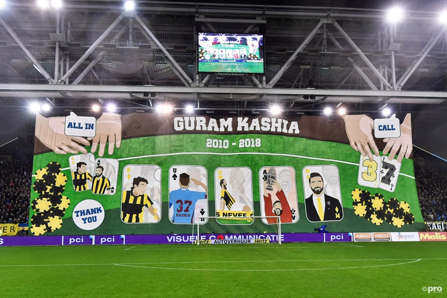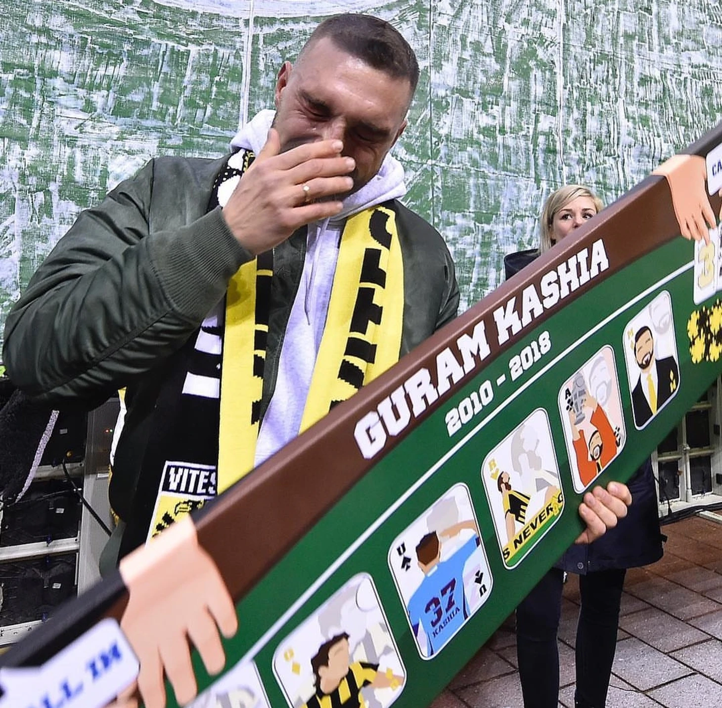 В перерыве состоялось прощание с легендой "Витесса", защитником Гурамом Кашия. Грузинский игрок начинал карьеру в "Динамо" из Тбилиси, после чего в 2010 году перешёл в "Витесс". В Арнеме он провёл 8 лет, покинув клуб по окончании прошлого сезона. За это время Гурам стал героем для местных болельщиков. Весной текущего года защитник обновил рекорд "орлов" по количеству матчей, проведённых в рамках Эредивизи, остановившись на отметке в 244 игры. За успехи в составе команды игрок получил специальный серебряный значок (такой есть у немногих). На прощание фанаты клуба подготовили великолепный баннер, который не оставил экс-капитана арнемцев без эмоций.