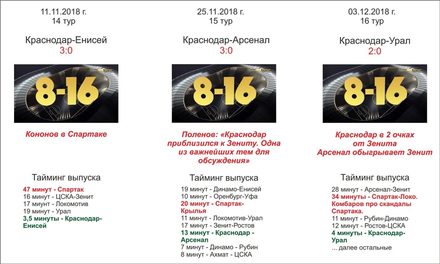 Программа «8-16» выходит на МАТЧ Премьер после каждого тура РПЛ. В ней рассказывается о матчах, болельщиках, голах и всем, что происходило на выходных. Считается, что обзору матчей «Краснодара» уделяется достаточно времени, но посчитали, сколько минут на самом деле уходит на разговоры о команде. Юрий Родригез посчитал в твиттере тайминги.