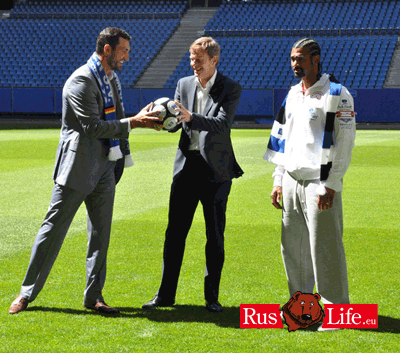 Владимир Кличко и его оппонент Дэвид Хэй, как известно, планируют провести свой бой на футбольном стадиона в Гамбурге. Во время совместной фотосессии Кличко решил продемонстрировать собравшимся репортерам, насколько виртуозно он может обращаться с футбольным мячом. Его первый же удар угодил в цель! Кличко послал мяч в лицо Йоахима Хильке (Joachim Hilke) – одного из боссов футбольного клуба «Гамбург». Смотрите фото!