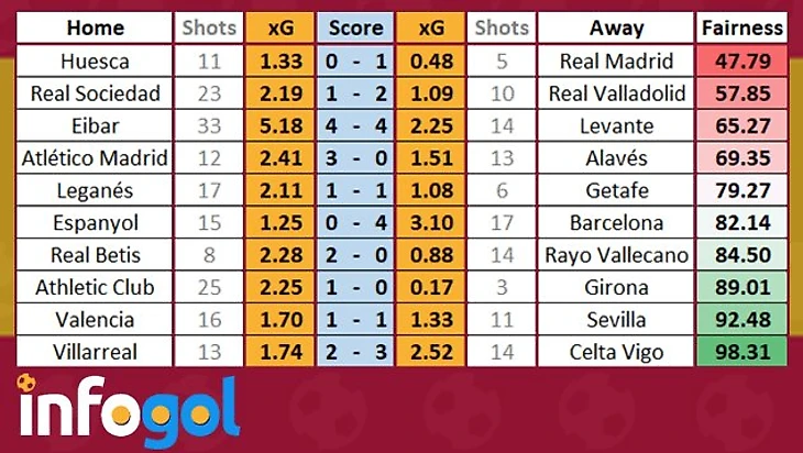 Самым несправедливым (с точки зрения модели xG) результатом стало домашнее поражение "Уэски" от "Реала" (0-1).