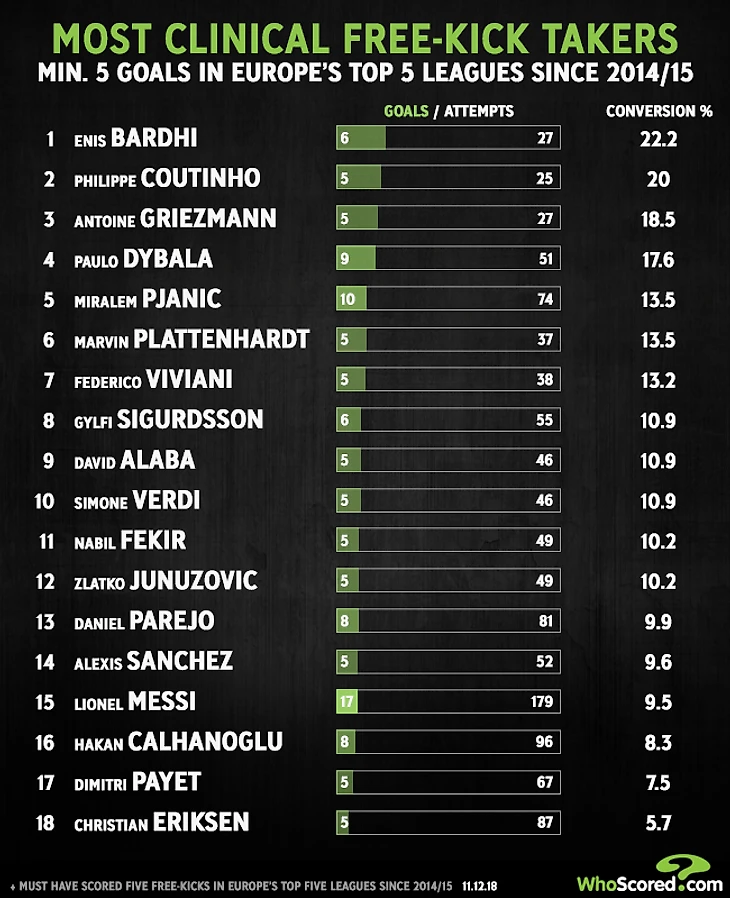 С сезона 14/15 больше всех в топ 5 лиг Европы со свободных ударов забил Месси (17), однако его конверсия не выдающаяся. Аргентинец имел 179 попыток и забил 17, что составляет ~ 9.5%. Однако стоит сказать, что эта статистика не учитывает попадания в створ или в перекладину/штангу.