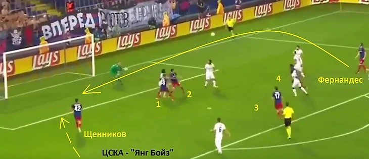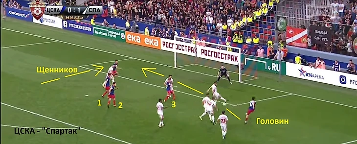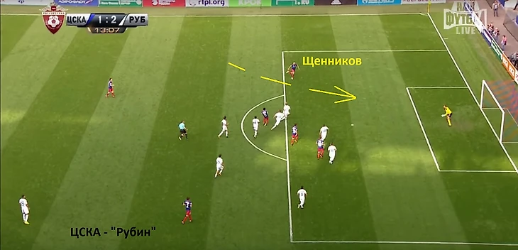 При атаках по правому флангу и через центр их очень много. Смело действовать Щенникову позволяет переход ЦСКА с приходом Гончаренко на модули 3-Х-Х - за срыв атаки есть, кому ответить. Вот и ускоряется футболист к чужим воротам. Не по краю, а в штрафную, откуда можно расстреливать "рамку".