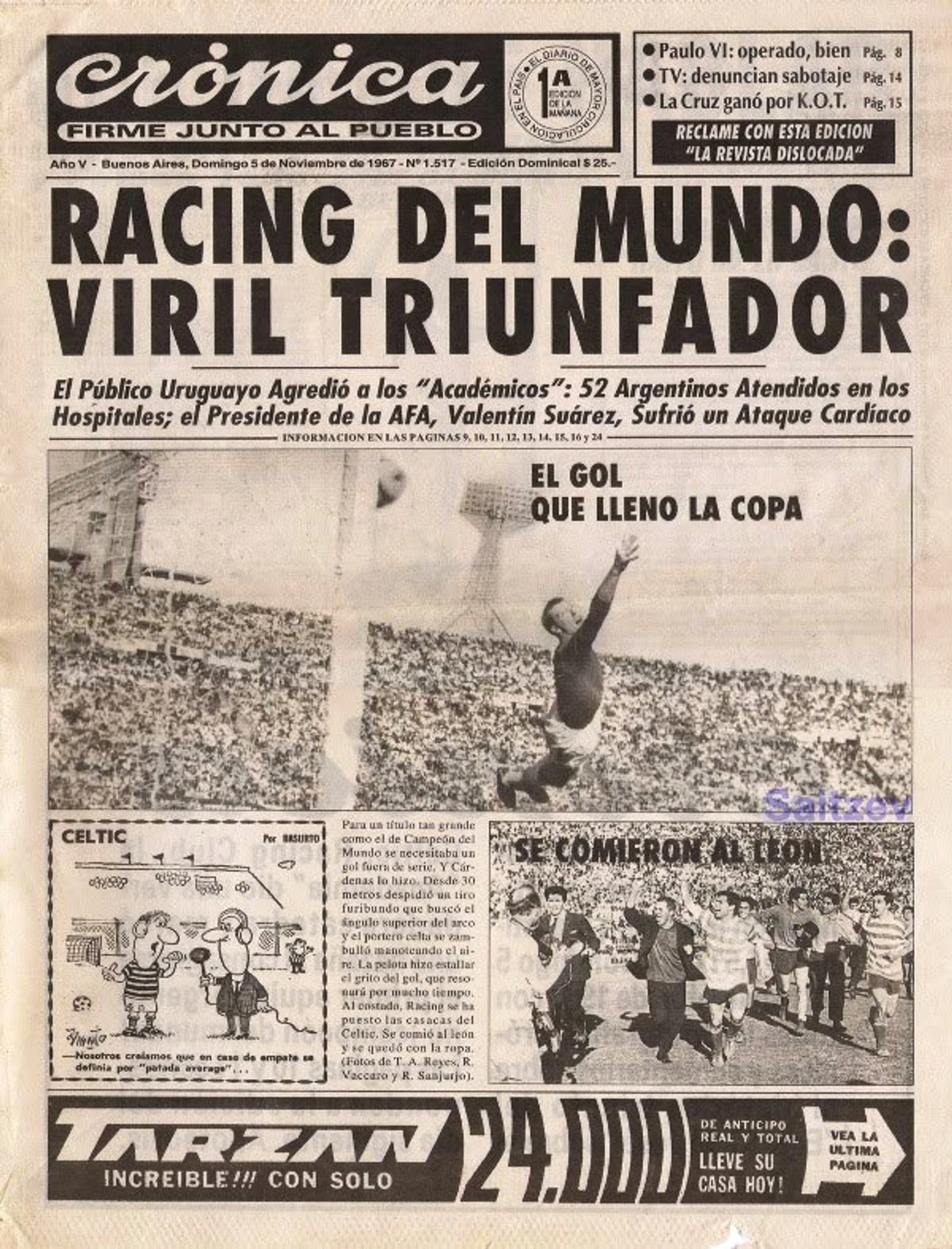 В матче за право называться лучшей командой планеты Расингу бросил вызов сильнейший клуб Европы - обладатель кубка Европейских Чемпионов, чемпион Шотландии, обладатель Кубка и Кубка Лиги Селтик из Глазго. 18 октября 1967 года на поле Хэмпден Парк в первой игре двухматчевого противостояния, в присутствии 100 000 фанатов, сошлись победители двух самых престижных турниров мира. Встреча прошла под подавляющем преимуществом британцев, еще в первом тайме они могли шесть раз отправить мяч в сетку ворот Сехаса. По сути, у Академии была единственная возможность забить, когда Родригес вышел один на один, но в очной дуэли вратарь Кельтов Ронни Симпсон оказался сильнее. Расинг, будучи не в состоянии сдержать напор Селтика, начинает играть грязно. В итоге, от столкновения с Карденасом, форвард Селтика Джимми Джонстон вынужден был доигрывать с перевязанной бинтом головой. Несмотря на упорство Академии, Селтик добился своего. На 69 минуте, после подачи с угла поля, мяч в сетку отправил капитан Кельтов Билли Макнилл, которому почти сразу прилетело в глаз от кого-то из защитников аргентинской команды. К финальному свистку счет не поменялся, победа хозяев 1:0.