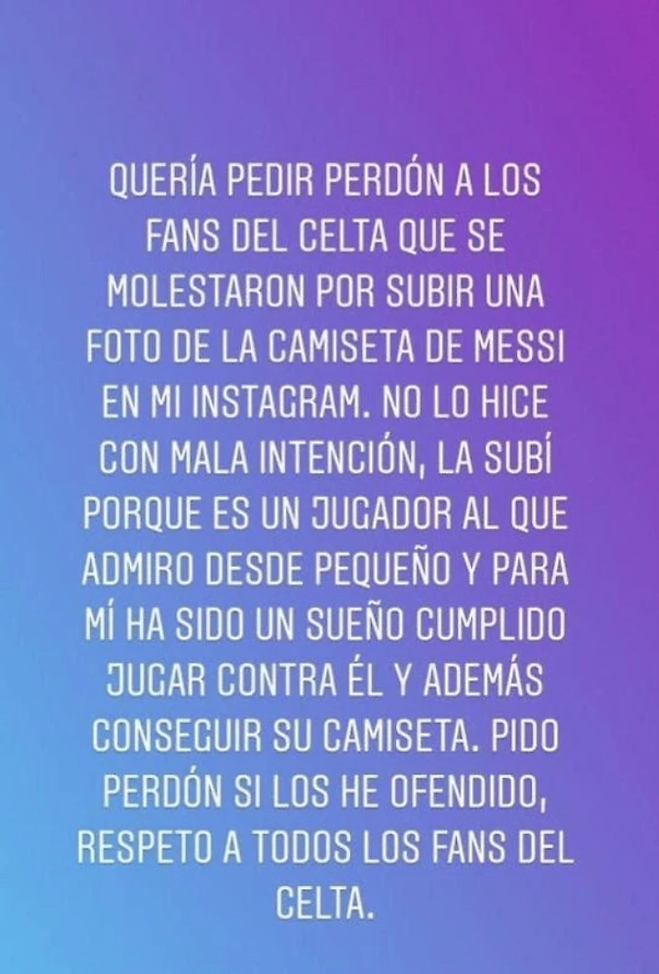Болельщики были настолько рассержены, что на несколько часов защитник Сельты был вынужден закрыть профиль и удалить гневные комментарии. Затем Роберт попросил прощения и объяснил, что не хотел никого оскорбить. Играть против Месси и получить от него футболку - его детская мечта, об осуществлении которой он и хотел рассказать.