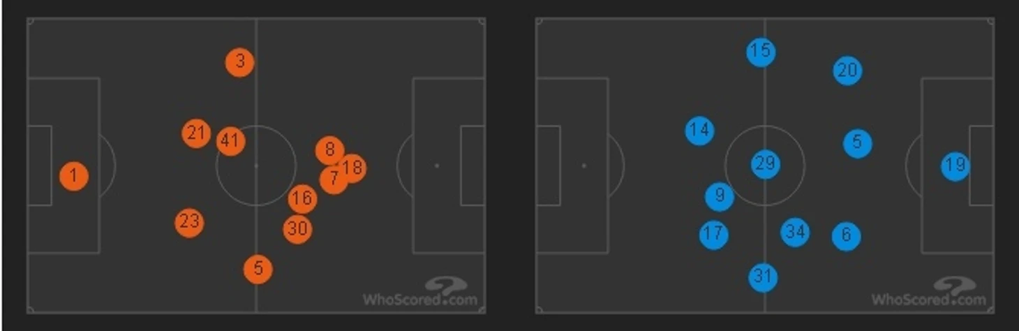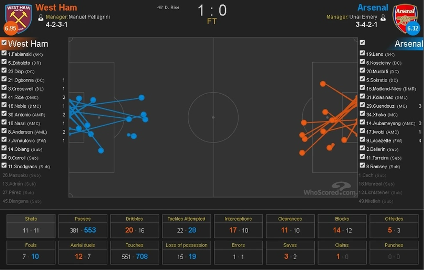Начнём с общей картины. Игра была равной в первом тайме как по количеству моментов, так и по качеству. Обе команды создали по нескольку опасных моментов, однако хозяева чуть больше контролировали игру. По Арсеналу можно сказать, что в атаке был расчёт больше на спонтанные действия футболистов. Ожидалось, что будет упор на левый фланг и связку Ивоби-Колашинац, но мы увидели не так много выпадов с их участием. То ли это задумка Эмери - присмотреться к сопернику и не рисковать - то ли соперник попросту не позволял играть в свой футбол. Тайм получился довольно-таки живой, никто в обороне не засиживался, обе команды старались атаковать. Уходя, так сказать, в статистику, мяч больше всего держался в центре поля - 48%. На половине поля Арсенала 33%, а на противоположной трети всего лишь 19%. Вест Хэм в основном играл через центр, где играли Насри, Арнаутович, Антонио, Андерсон и Нобл, который часто помогал из глубины. Изредка подключались Кресвелл и Сабалета. Та же самая картина у Арсенала: большое количество игроков в центре, редкие проходы с флангов.