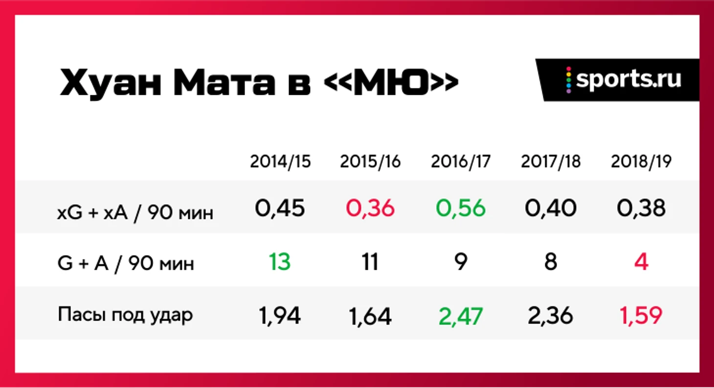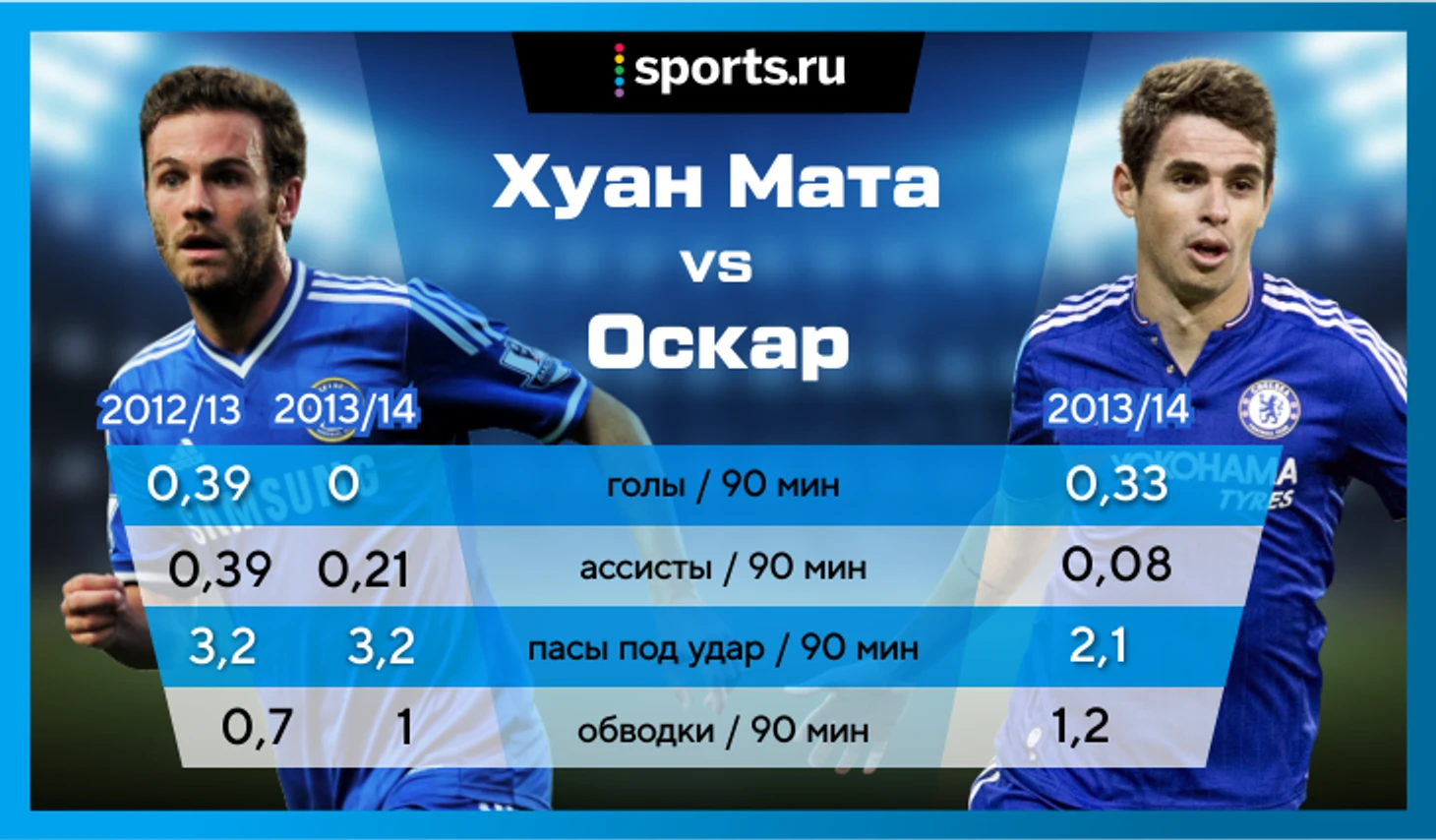 В свои последние месяцы в «Челси» Мата перестал забивать и стал хуже ассистировать. Особенно разительно это видно, если сравнивать второй сезон испанца с последними пятью месяцами в «Челси» и Оскаром, игравшим на той же позиции. Отсюда страшная для восприятия статистика: за первые 2 года в «Челси» Мата как плеймейкер отдал 25 голевых передач в АПЛ. За пять лет после этого – ровно столько же.