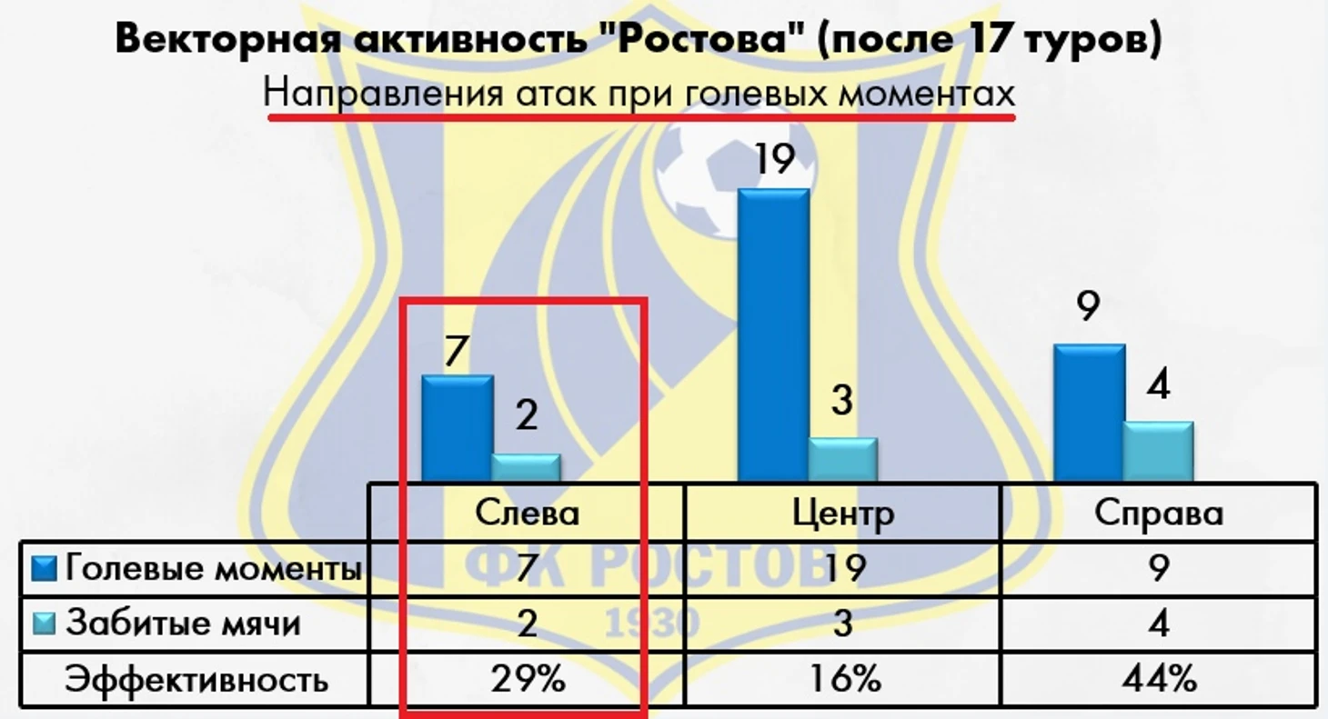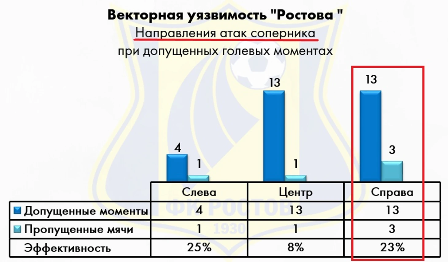 4. Через его фланг развивалось втрое больше атак с допущенными моментами у ворот «Ростова», чем через противоположный фланг Паршивлюка. 3 из 5 голов «с игры», которые пропустили дончане, пришли именно из зоны разделения ответственности Скопинцева и Вилюша.