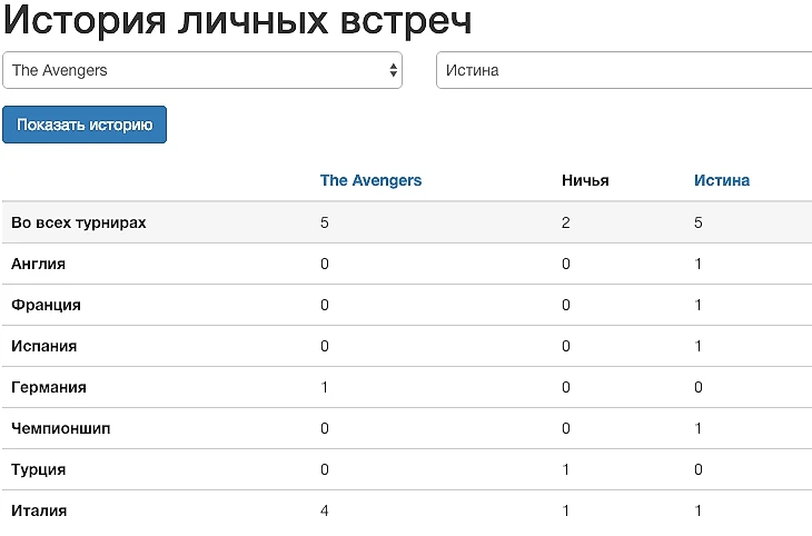 На сайте fantasyteams.ru появилась новая функция - история личных встреч. Выбираете любые 2 команды, нажимаете "Показать историю", и получаете статистику кто чаще побеждал, разбивку по турнирам, а также список всех матчей между двумя командами.