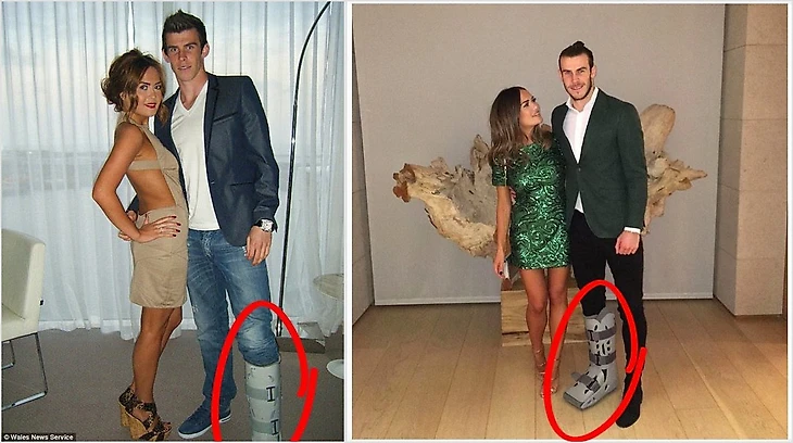 Гарет на обеих фотография запечатлен со своей женой, и на обеих у него на ноге гипс. Только на ранней фотографии гипс на левой ноге, а на поздней — на правой.