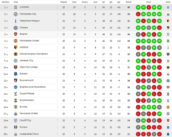 Перед Вашими глазами итоговая таблица АПЛ после двадцати трех туров. "Кардифф" опускается в зону вылета, "волки" поднимаются в первую половину таблицы. Может ли еще что-либо спасти "Хаддерсфилд"? Мы все это еще узнаем, главные матчи впереди. Спасибо всем прочитавшим.