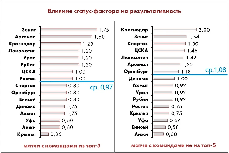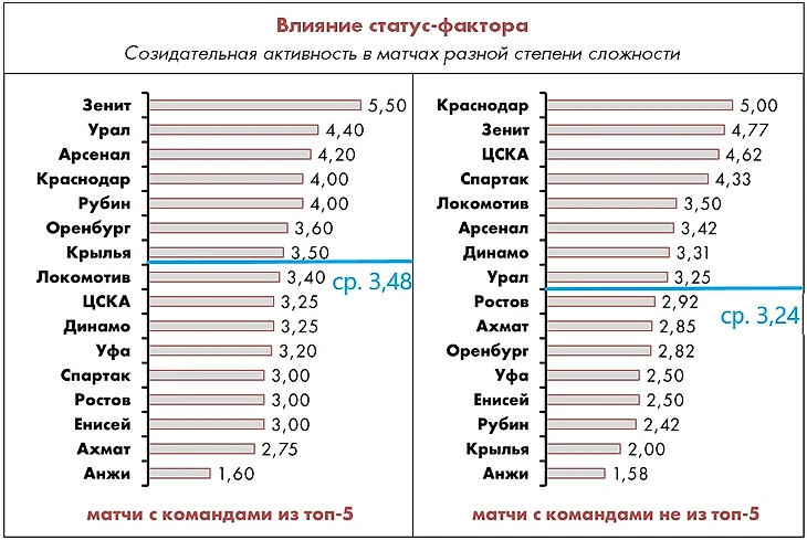 Лучше всего в матчах «повышенной сложности» чувствуют себя заточенный на контратаки «Арсенал», охотно играющий на встречных курсах и слегка бесшабашный «Урал», а также различные модели «автобусов» («Рубин», «Оренбург», «Уфа», «Крылья»).