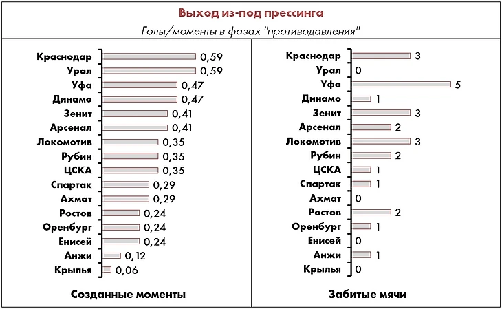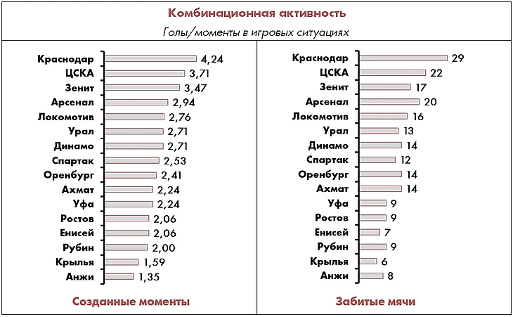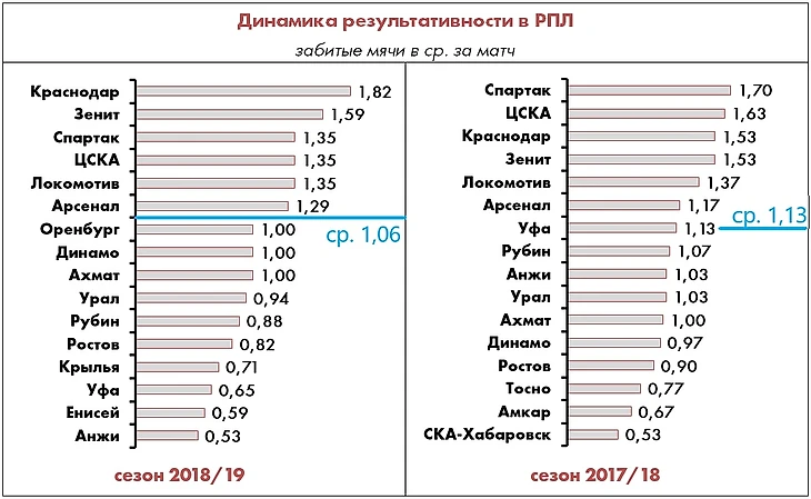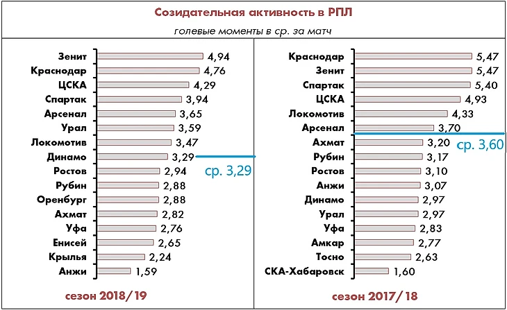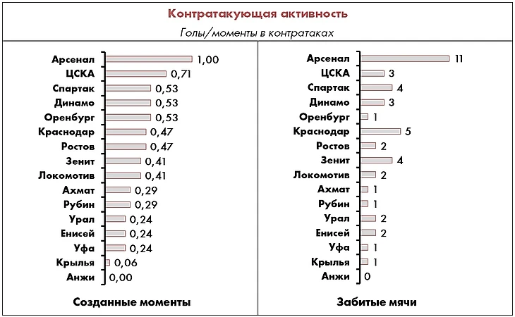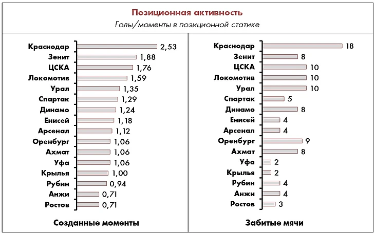 Что касается неэлитных команд, в авангарде атакующей мысли по-прежнему идет «Арсенал», подтверждая свой прошлогодний уровень, а «Урал» и «Динамо» сделали очевидный шаг вперед (+21% и +11% соответственно), хотя в реализации надо прибавлять и тем, и другим.