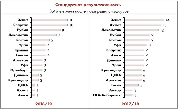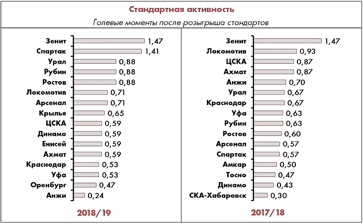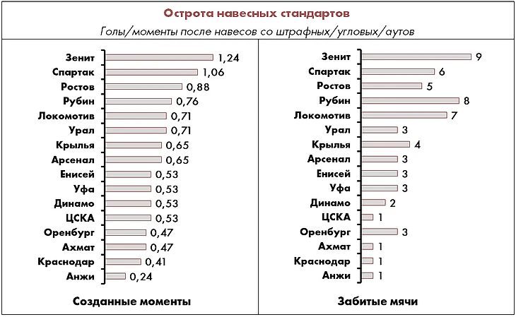 Кроме того, в статистике «ударных стандартов» не учтен гол Шатова «Арсеналу», который залетел напрямую после подачи с фланга, никого не задев – этот эпизод с поправкой на игровой контекст учитывается как навесной стандарт, а не ударный.