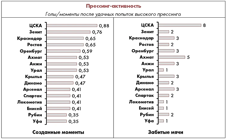 10. В прессинг-атаках лучше всех в лиге действует ЦСКА, который уже забил 8 голов непосредственно после насильственных захватов владения на чужой половине поля.