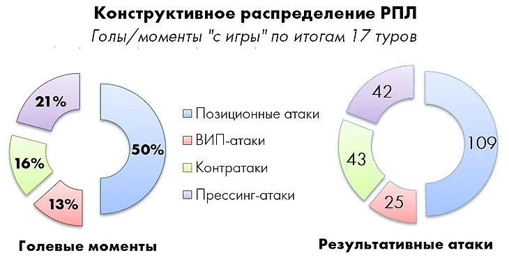 Конструктивное распределение голевых моментов и забитых мячей в зависимости от типа игровых ситуаций выглядит следующим образом:
