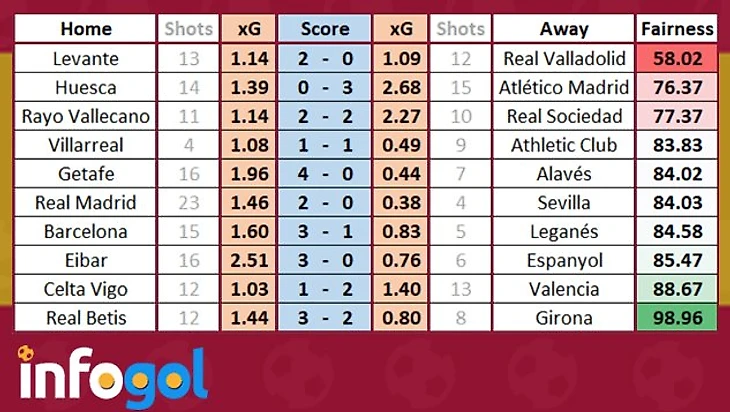 Оценка справедливости результатов 20-го тура Ла лиги от Infogol