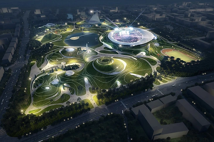 2. Проект Китая Quzhou Sports Campus, особенность стадиона, то что он будет находиться внутри холма 30 000 мест