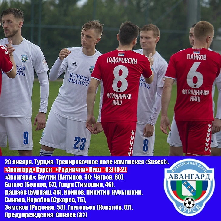 Сине-белые уступили в контрольном матче ФК «Раднички», занимающему вторую строчку в сербской Суперлиге. Наша команда пропустила трижды на 22, 28 и 65 минуте. У соловьёв были неплохие шансы в первом тайме. Дважды опасно со штрафных бил Максим Григорьев. В одном из эпизодов ворота красно-белых спасла перекладина.