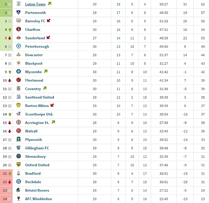 Итак, в январе «Лутон Таун» сыграл 7 матчей, два из который были кубковыми. Показатели такие: 3 победы, 3 ничьи и 1 поражение (мячи: 9 - 4). Это хуже, чем в декабре, но зато прямые конкуренты выступали хуже нас (особенно это касается «Портсмута»), что и позволило «Лутону» взобраться на вершину таблицы Лиги Один. Собственно, так и выглядит таблица после января: