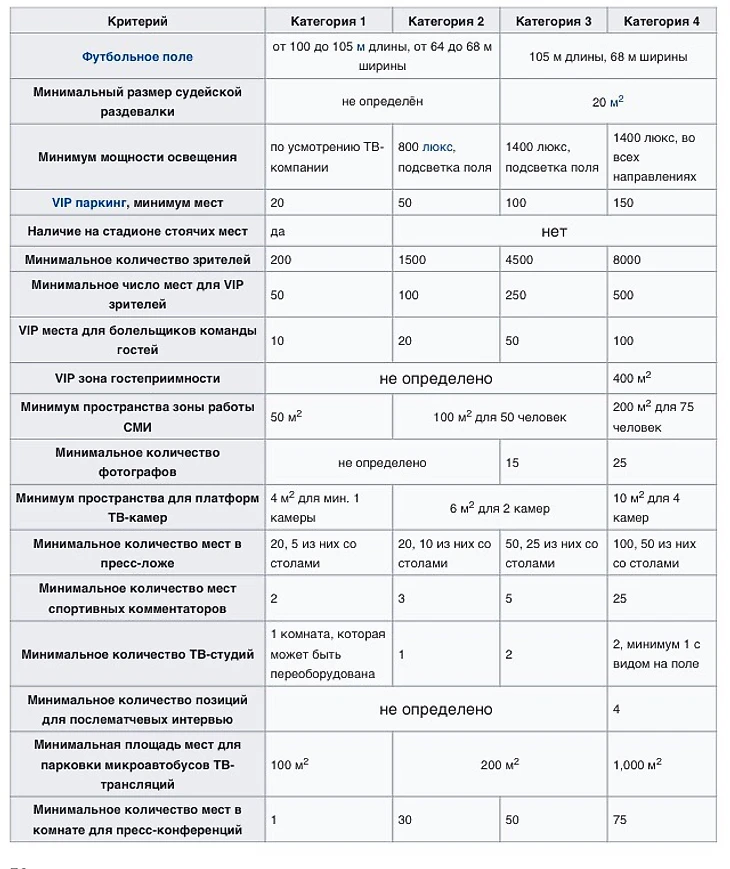 Такие критерии выдвигает УЕФА, чтобы получить высшею категорию. На самом деле, не нужны не какие критерии, чтобы выявить лучший стадион. Потому что, во всех стадионах есть, изюминка, будь это красив стадион изнутри или снаружи, или находится в красивом месте. Их надо любить, потому что внутри них мы получаем самые настоящие эмоции.