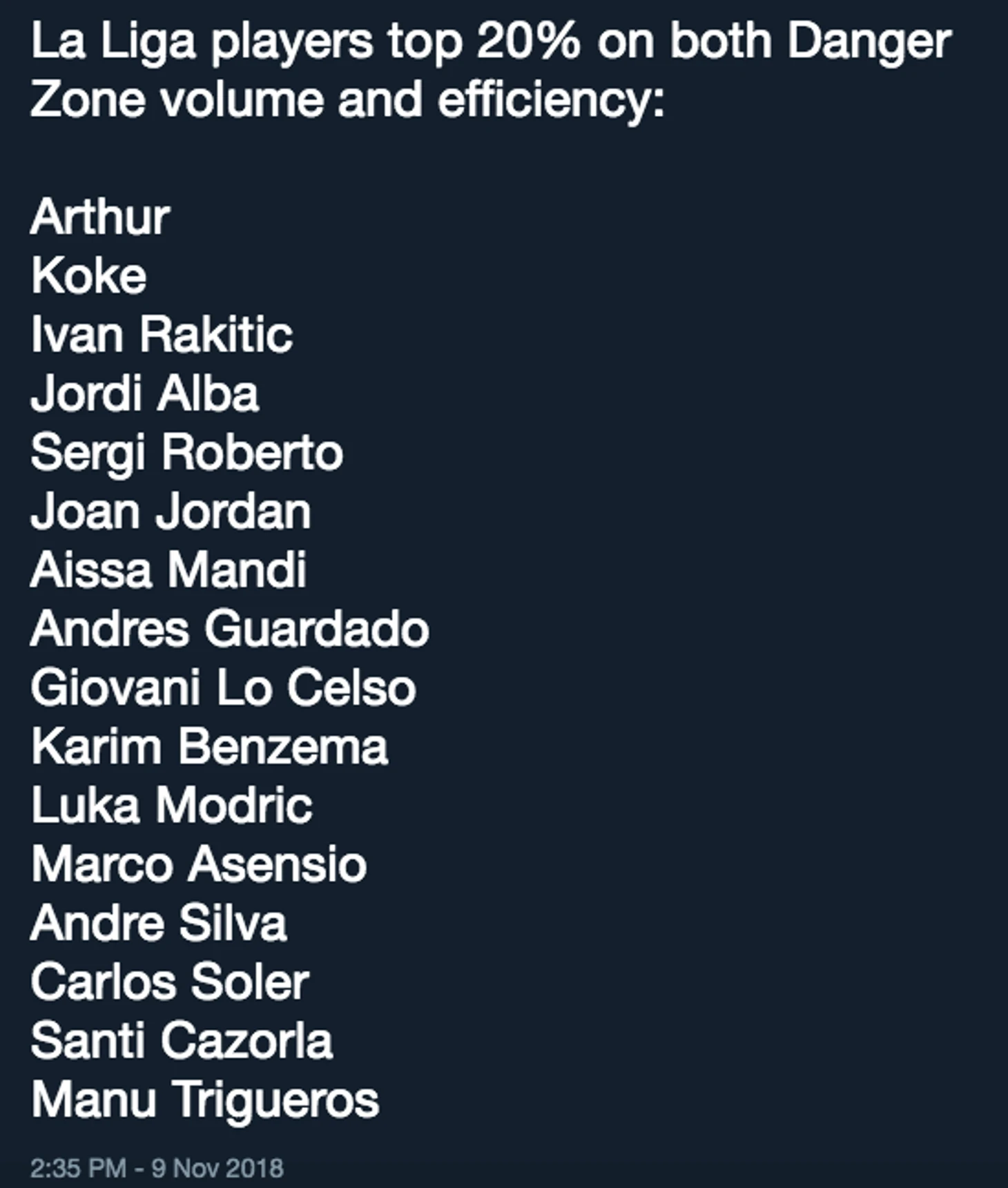 · доля пасов в «приобретенных ярдах» - 69%, так что его нельзя назвать статичным футболистом, как Парехо/Тригейрос, но он и не является специалистом по продвижению мяча на ведении, как Ло Чельсо… где-то между