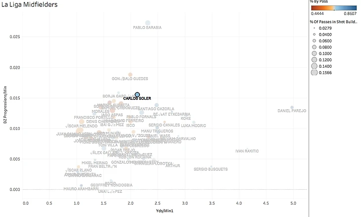 Мы можем видеть, что Солер на графике отстает только от нескольких полузащитников по danger zone progressions. Лучшим же по данному показателю является Сарабия из Севильи. Солер находится в приличной компании с такими игроками, как Ракитич / Парехо / Кроос, хоть и немного отстает от них в «приобретенных ярдах в минуту». Другие игроки, находящиеся рядом с ним по «приобретенным ярдам в минуту» / deep progression, являются Беньят, Санти Касорла, Пабло Форналс и Иско. Это тоже достойная компания... Борха Гарсия тоже находится рядом, но его «приобретенные ярды через пас» ниже среднего заканчиваются ударом по воротам команды соперника, так что остальные «смотрят на него свысока».