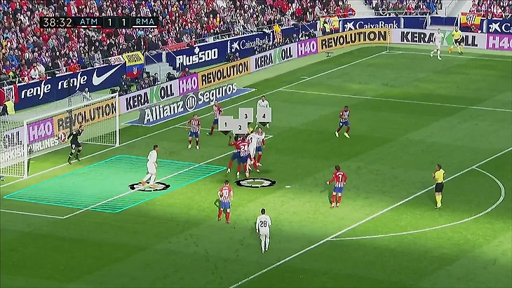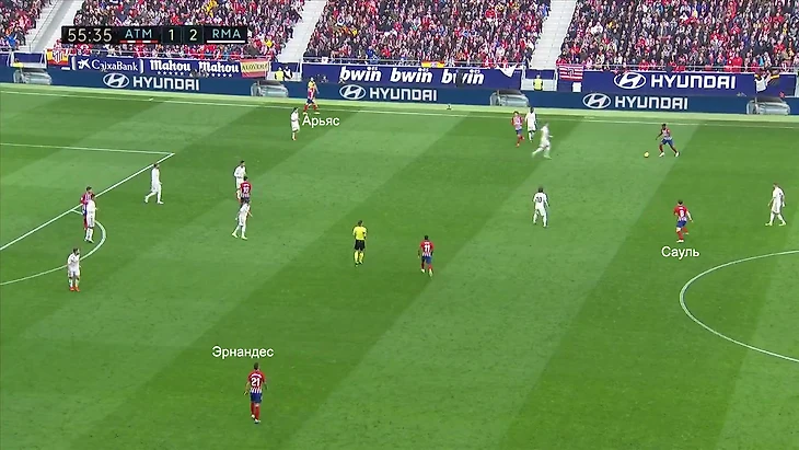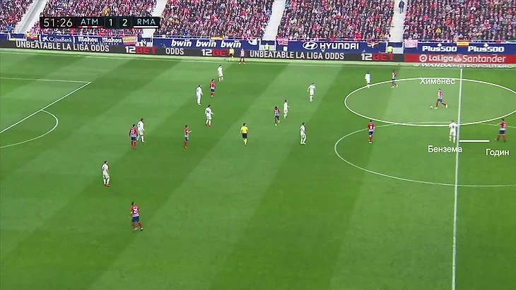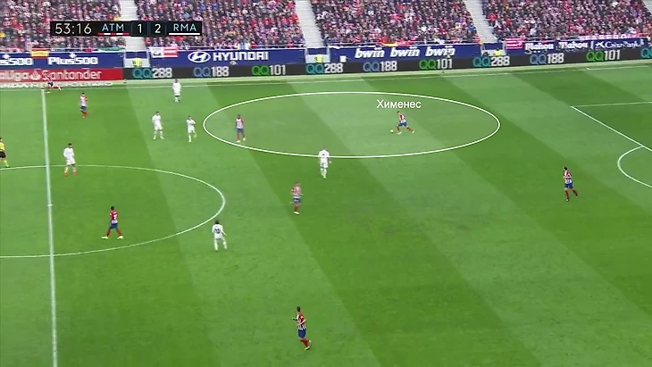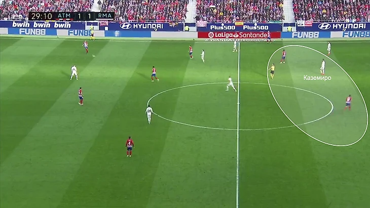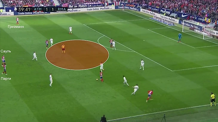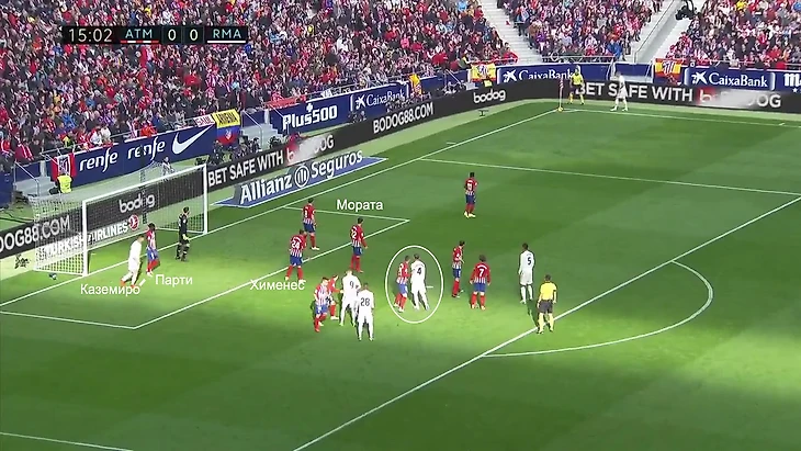 В роли неудачников выступили Парти, Хименес, Мората и Эрнандес, но все виноваты в равной степени. «Атлетико» использует гибридную систему опеки: часть футболистов обороняется персонально, часть – зонально и играет по подаче. Мората и Хименес в данном случае без соперников и действуют по подаче. Парти играет против Каземиро, Эрнандес – против Рамоса: