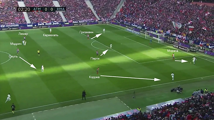 2. «Атлетико» начал с очень высокого прессинга. Структура давления предполагала компактность и перекрытие ближних к мячу футболистов. Крайний защитник «Реала» на дальнем фланге получал свободу – фланговые игроки «Атлетико» Лемар и Корреа играли против Модрича и Крооса: