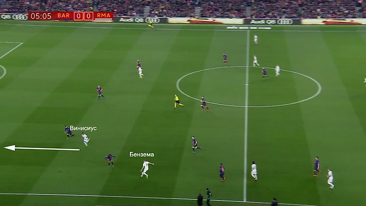 Обычное подстроение других команд в такой ситуации – трансформация схемы в 4-4-2, где один из центральных полузащитников (например, Кроос) становится ситуативным левым вингером. Но у «Реала» не было четкого перестроения и плана. Кроос плох в игре без мяча и не всегда справлялся с подобной подстраховкой Винисиуса.