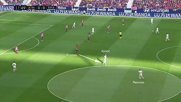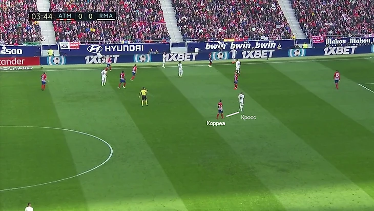 Иногда доходило до совсем радикальных ситуаций. «Атлетико» поджимает соперника при ауте. При аналогичной структуре прессинга Корреа идет за Кроосом на чужой фланг. Вся правая сторона остается свободной: