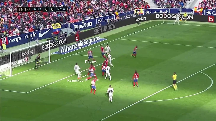 Команда Чоло комически ужасно сыграла при угловом «Реала». В момент удара 4 футболиста «Атлетико» боролись с одним Серхио Рамосом – и проиграли. Каземиро был абсолютно свободен в момент удара: