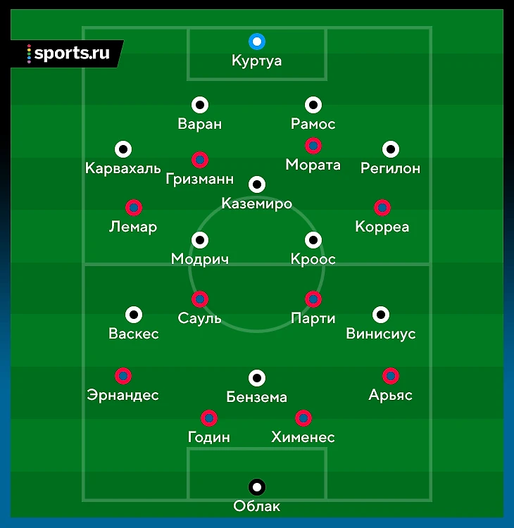 1. Главным сюрпризом в составе Диего Симеоне стала связка в центре поля – Сауль и Томас Парти. Альтернатива – Парти с Родри в центре и Сауль на фланге – гарантировала бы «Атлетико» больше надежности. Еще одним решением был выбор между Сантьяго Арьясом и Хуанфраном на правом фланге. В последнем матче против «Бетиса» Хуанфран вынуждено закрывал левый фланг, но сейчас такой необходимости не было – он мог вернуться на привычную позицию, но Чоло предпочел Арьяса.