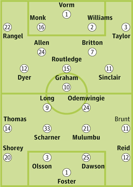 Суонси является единственной командой премьер-лиги, которая не забила ни единого гола и это последнее, что нужно валлийцам для того чтобы почувствовать себя своими в высшем дивизионе английского футбола. В этом контексте вызывает большие опасения потеря центрального полузащитника Стивена Колкера, взятого в аренду у Тоттенхэма и Кеми Августина, травмировавшего подколенное сухожилия. Гарри Монк, капитан команды, не сможет беспроблемно заменить Колкера, позицию же Августина, как ожидается, займет Джо Аллен. Вест Бром перед выездом в Уэльс также лишился своего ключевого игрока - центрального защитника, Габриэля Тамаша, получившего дисквалификацию на три игры за удар локтем Джеймса Вона в матче против Норвича на прошлой неделе, завершившемся победой дроздов 1:0. Вероятно, Тамаша на позиции центрдефа заменит Крейг Доусон, сделавший дубль в первом же матче за сборную Англии-21, состоявшемся две недели назад. Также не помогут гостям сегодня Крис Брант и Золтан Гера, получившие травмы колена и голеностопа, соответственно.