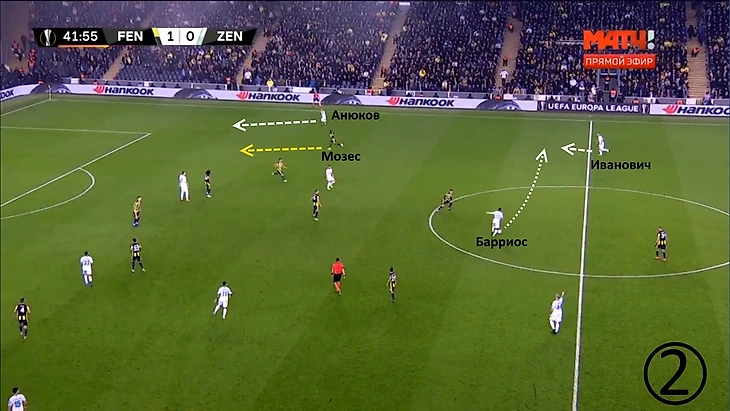 Продолжение эпизода. Нельзя сказать, что Анюков совсем не подключался вперёд – в данном эпизоде он всё же пешком дошёл до той зоны, откуда уже надо делать рывок, но было уже слишком поздно. Во-первых, Мозес уже контролировал его забегание, а в скорости Виктор явно не проиграл бы. Во-вторых, мяч оказался у Барриоса, который не может вырезать такой сложности пасы (исполнять заброс правой ногой в данной ситуации технически сложнее, чем левой).