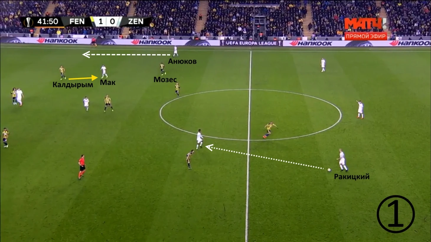 Ракицкий смотрит на правый фланг, готовясь к диагонали. Атаковать фланг – разумное решение для Анюкова, поскольку Калдырым опекает Мака, а Мозес располагается достаточно узко, не контролируя расположение Александра за спиной. Однако капитан «Зенита» не делает рывок, поэтому Ракицкий пасует Барриосу.
