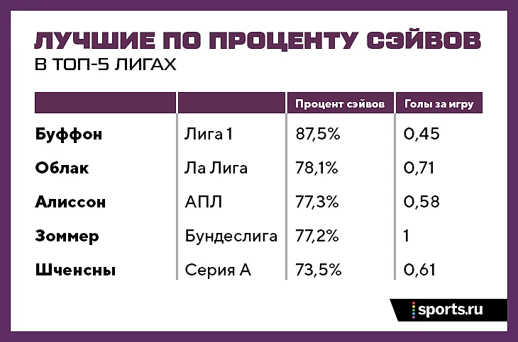 Если бы речь шла о сухих матчах (без отраженных ударов) или просто количестве сэйвов, то уровень команды оказывал бы реальное влияние. Сухие матчи проще набирать в топ-клубах, а количество сэйвов – в маленьких командах. А вот процент сэйвов не связан с уровнем команды.