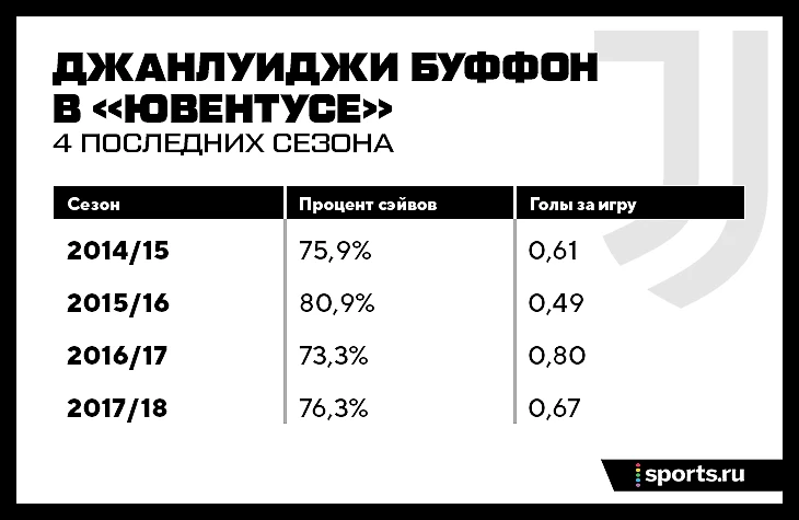 В последние 4 сезона Буффон был нестабилен (по своим высочайшим стандартам) даже в рамках любимого показателя. В последние два года и вовсе опустился до уровня просто хорошего, а не топового вратаря. Все это на фоне одной из лучших оборон в истории Серии А.