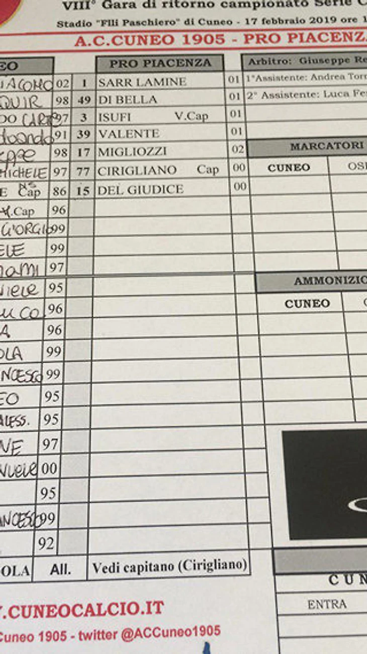 На матч серии С против «Кунео» «Про Пьяченца» не смогла выпустить полный состав, на поле вышли парни в возрасте 16-19 лет.