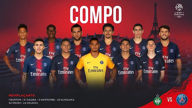 "ПСЖ": Ареола, Дани Алвес, Тиагу Силва, Бернат (Дагба, 60), Маркиньюс, Керер, Дракслер (Кюрзава, 69), Паредес, Ди Мария (Кимпембе, 85), Мбаппе, Диаби.