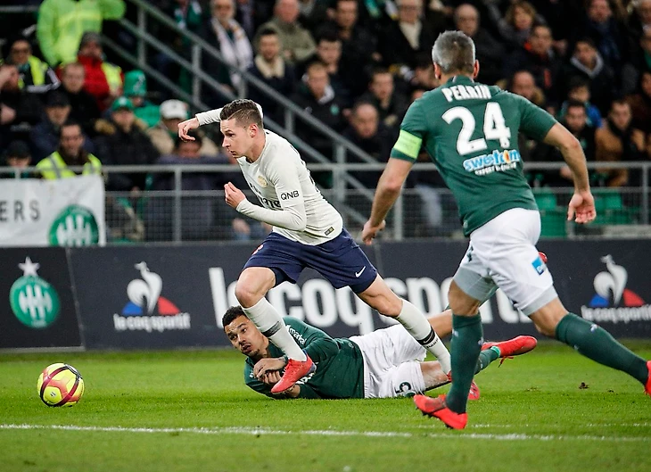 Как и ожидалось, на поле мы не увидели зрелищной игры в исполнении обеих команд. В дебюте встречи Сент-Этьен отдал мяч парижанам, максимально выдвинув вперед линию обороны и прессингуя полузащитников гостей на их половине поля. Эта тактика едва не оказалась провальной, так как уже в первые пять-семь минут игры они получили два опаснейших заброса с половины поля ПСЖ на линию своей штрафной, где поочередно Ди Мария и Мбаппе не смогли грамотно распорядиться мячом. К середине тайма хозяева немного опустились к своим воротам, но и тут парижане воспользовались неудачно подобранной тактикой соперника. Практически каждая атака начиналась на левом фланге Диаби, куда постоянно смещались Бернат, Ди Мария и Дракслер, создавая численный перевес и через короткий пас взрезая оборону “стеффануа”. Единственное, чего не хватало – завершающего удара. Мбаппе пока не готов заменить травмированного Кавани именно в центре штрафной, когда соперник насыщает центр защиты и нужно оттеснить соперника или сыграть на опережение. В скоростном прорыве молодой француз как всегда создавал моменты, но Стефан Рюффье уверенно справился с его ударами. Был отличный момент у Юлиана Дракслера, но немцу не хватило точности в завершающей стадии атаки.