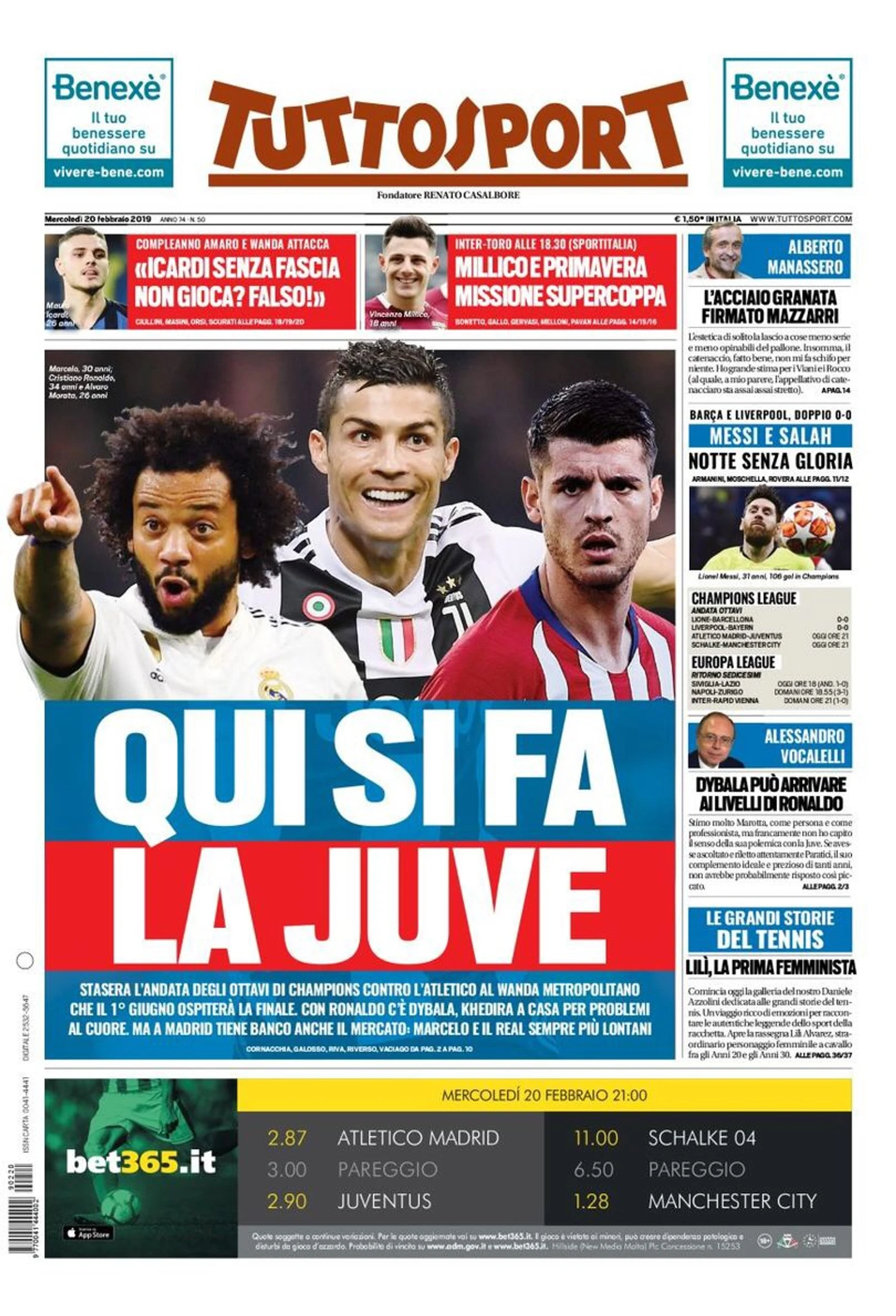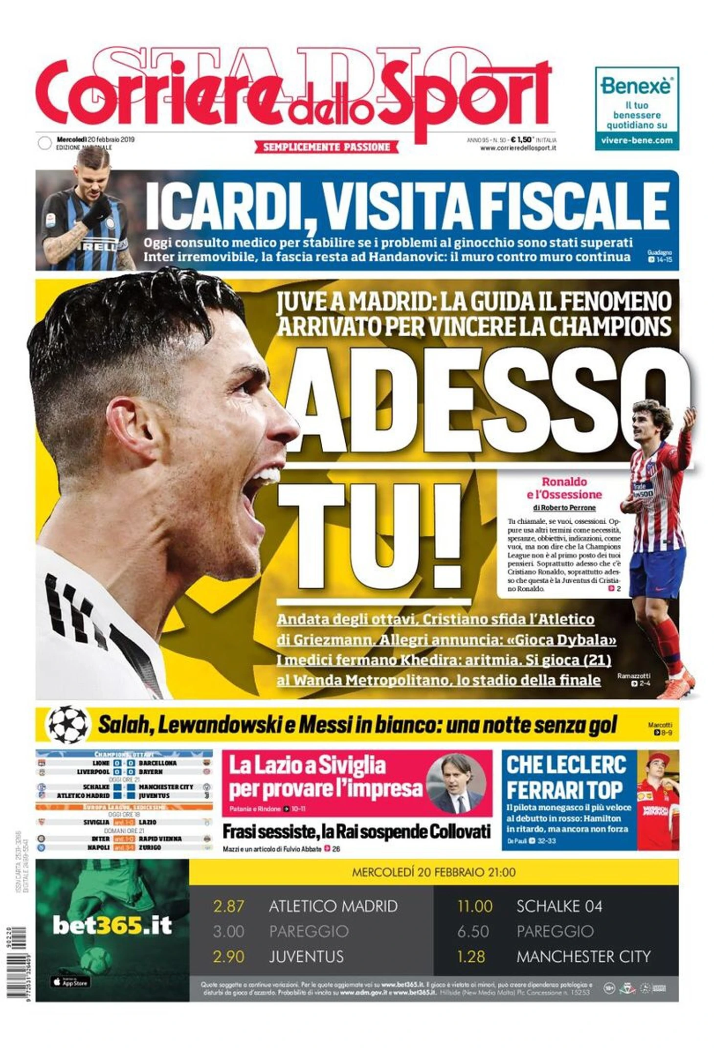 «Юве» в Мадриде: ведомые феноменом, они прибыли, чтобы выиграть Лигу Чемпионов. Первый матч 1/8-финала, Криштиану противостоит «Атлетико» Гризманна. Аллегри объявил: «Дибала сыграет». Врачи остановили Хедиру: аритмия. Игра в 21:00 (CET) на «Ванда Метрополитано», стадионе финального матча.
