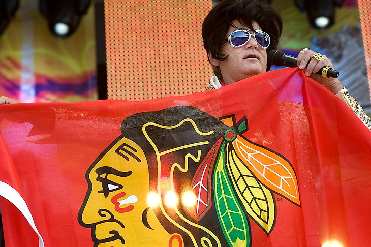 В образе Элвиса Пресли с флагом хоккейного клуба "Чикаго Блэкхокс" на концерте Эрика Клэптона.