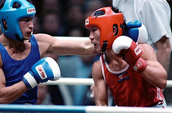 На боксерском ЧМ-1989 в «Олимпийском» участвовали 20-летний Костя Цзю и Юрий Арбачаков (он слева на фото в поединке против северокорейца) – первый российский чемпион мира среди профессионалов.