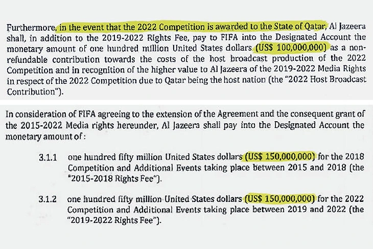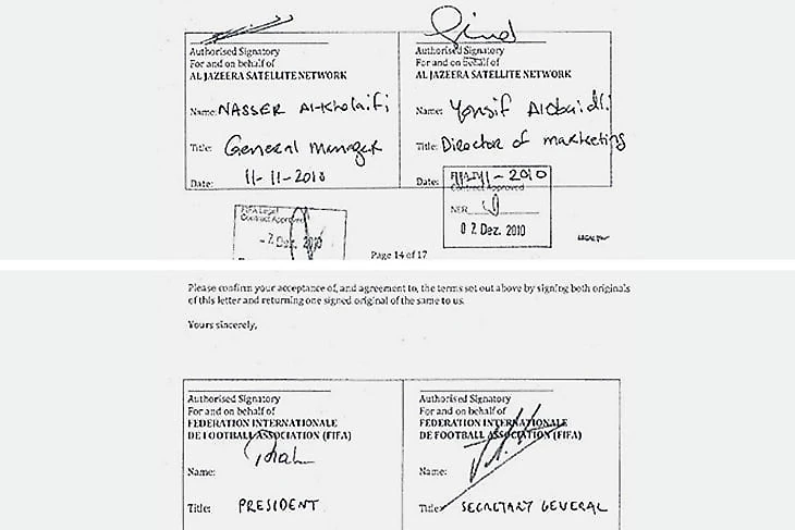 • За 21 день до выборов стран-хозяек ЧМ-2018/2022 катарский канал Al Jazeerа (им владеет Хамад бин Халифа Аль Тани, эмир Катара) подписал с ФИФА ТВ-контракт стоимостью 400 млн долларов. В подтверждение The Sunday Times публикует скриншоты – три ключевых пункта договора и подписи генменеджера Al Jazeera Нассера Аль-Хелайфи (нынешний президент «ПСЖ» и член исполкома УЕФА), директора по маркетингу канала, президента ФИФА Йозефа Блаттера и генерального секретаря Жерома Валька.